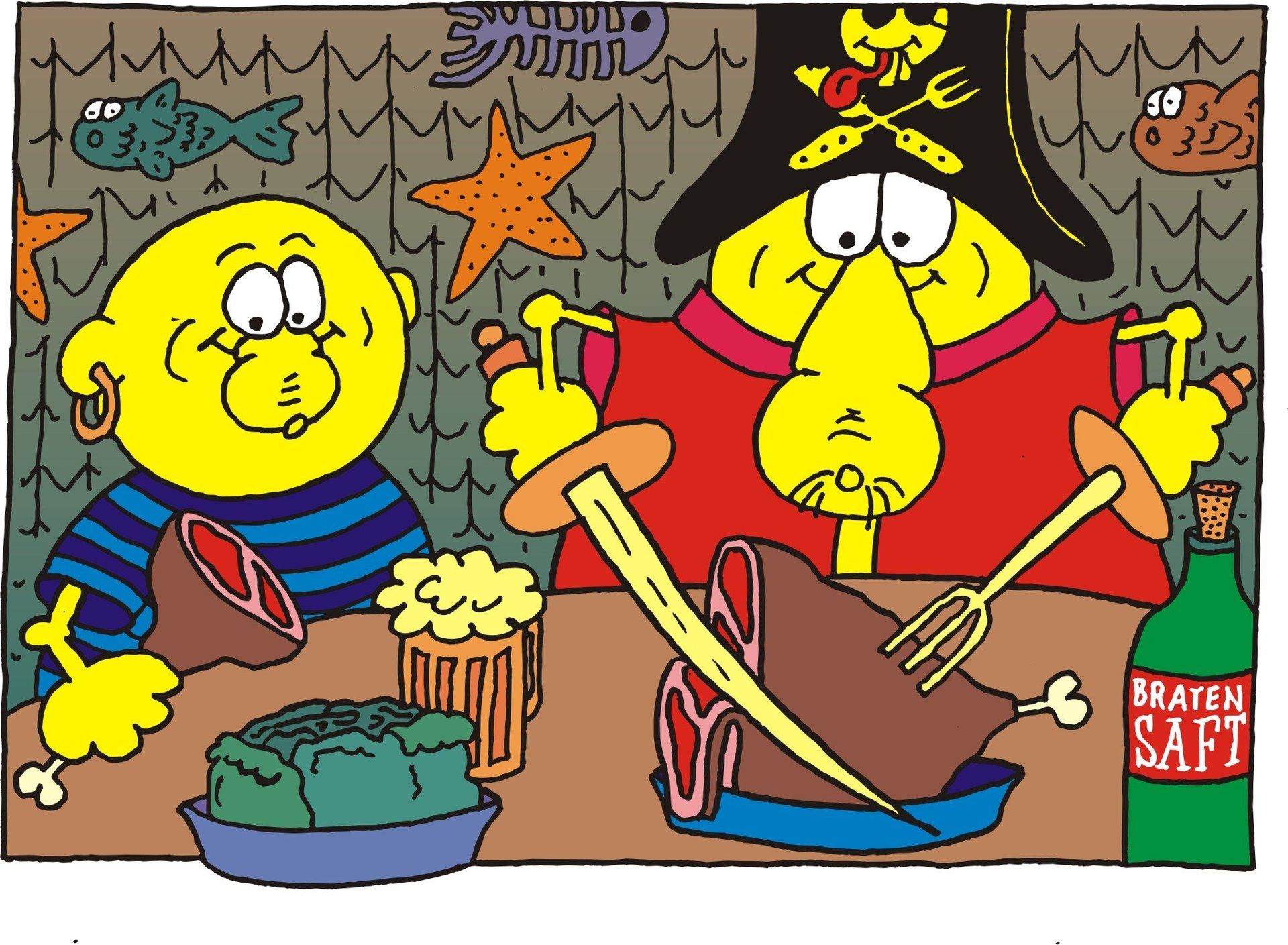 Sometimes there was even noodles on board: Cook "Ess-Meeralda" whistled while singing and cooking noodlesthrough the galley of the sea-cedes. She then handed it over to a wild boar for the pirate roast! With ketchup, of course, becauseKetchup looks like real blood, and that's why it's good for us pirates....